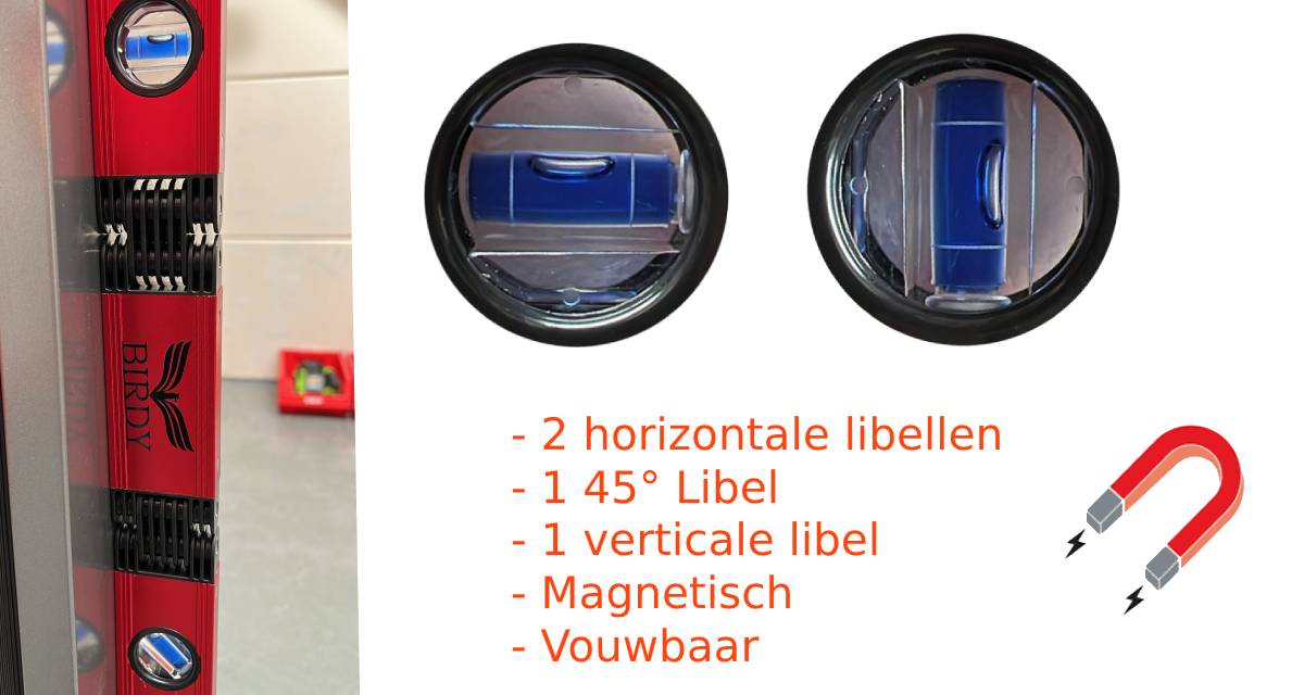 De Birdy Flex-Snake is voorzien van vier nauwkeurige libellen: twee horizontale, één onder een hoek van 45° en één verticale. Deze zijn gemaakt van slagvast, helder acrylglas, wat zorgt voor maximale duurzaamheid en goede afleesbaarheid onder verschillende lichtomstandigheden. Hierdoor ben je altijd verzekerd van een betrouwbare meting, ongeacht de situatie.