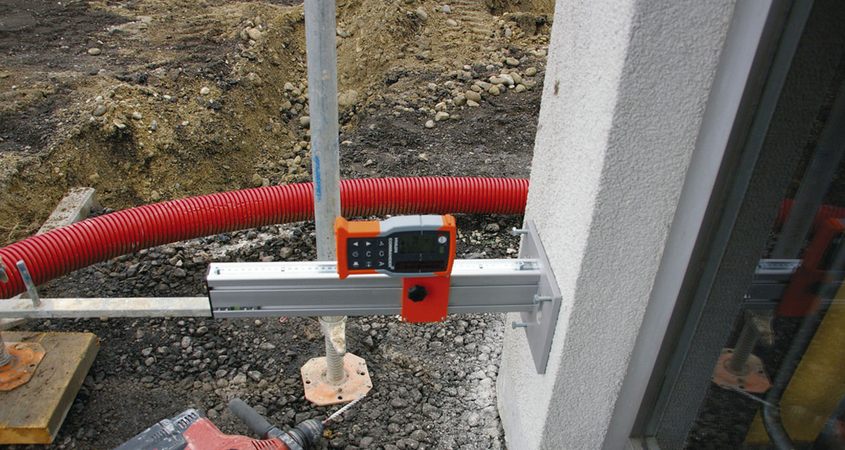 De Nedo gevelbouw adapter voor ontvanger wordt aan de muur opgehangen, m.b.v. de geïntegreerde buis libellen en 3 stelbouten kan deze nauwkeurig afgesteld worden. Dankzij op de bovenzijde aangebrachte mm aflezingen en de verschuifbare slede met Nedo Commander2 schroefdraadaansluiting kunnen rotatielaser en laserontvanger gemakkelijk op de gewenste afstand van de muur worden geplaatst. De afstand tussen laservlak en gevel kan dan d.m.v. deze beweegbare slede verschoven worden van 45 mm tot ca. 490 mm. De nieuwe gevelbouw adapters zijn optimaal afgestemd op de volautomatische rotatielaser PRIMUS2 HVA met AutoAlign-functie en de laserontvanger COMMANDER2 en vormen in combinatie met deze apparatuur een professionele complete oplossing voor de gevelbouw.