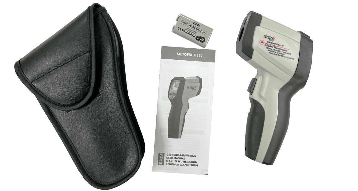 De LEVELFIX TI810 infrarood thermo-/hygrometer wordt geleverd met 9v batterij in een stevige tas.
