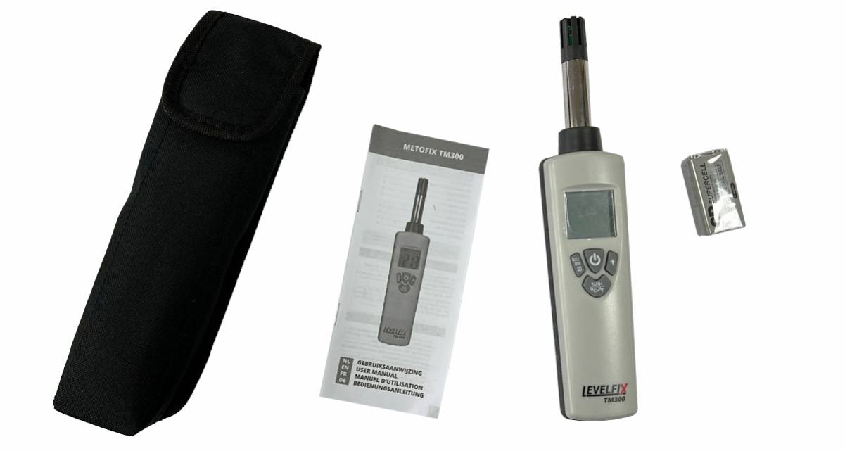 De LEvelfix TM300 thermo-hygrometer wordt geleverd met 9v batterij in een stevige tas.