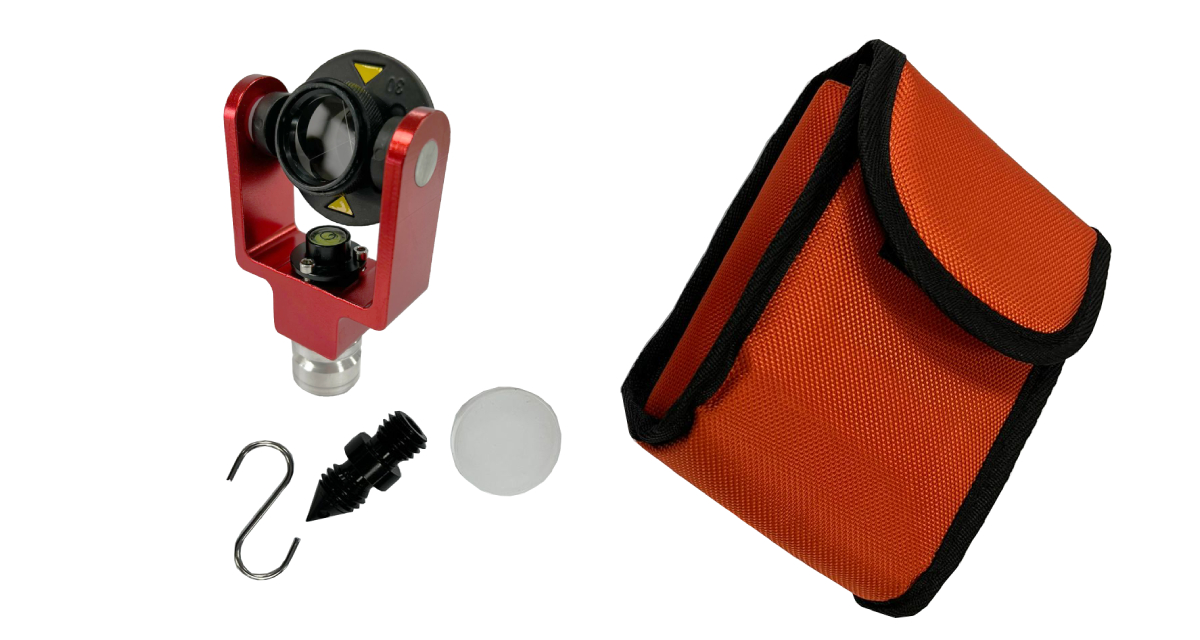 Dit mini prisma zit in een metalen houder en huis met dubbelzijdige doelplaat; heeft een constante van 0 of 30mm en is naar boven en beneden kantelbaar in de houder. D.m.v. het vaste doosniveau welke in de houder is gemonteerd kan het prisma waterpas geplaatst worden. De prisma houder is voorzien van een 5/8″ aansluiting aan de onderzijde voor montage op een prismastok of de meegeleverde punt.